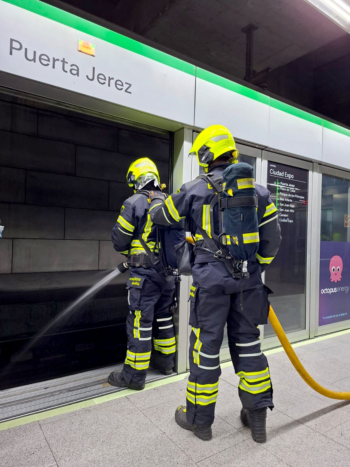 Sevilla, octubre 2025.- La madrugada del 22 de octubre, Metro de Sevilla realizó un simulacro que consistió en un incendio en un tren detenido en el andén de la estación Puerta Jerez.